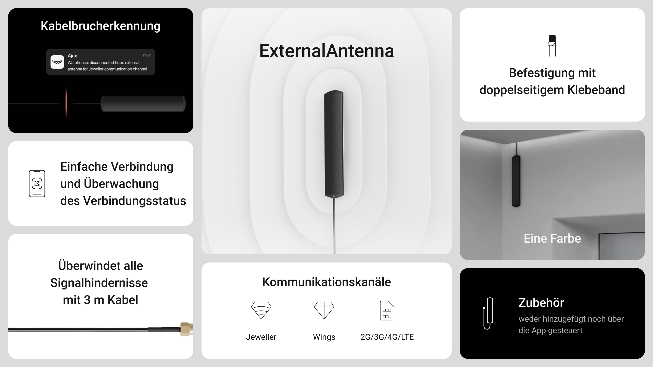 Die schwarze ExternalAntenna verbessert die Kommunikation zwischen der Hub-BP Zentrale und den angeschlossenen Komponenten oder Mobilfunknetzen. Dies ist besonders nützlich, wenn die Hub-BP Zentrale in z.B. einem Tresorraum, einem Stahlbetonraum oder an einem anderen Ort installiert ist, an dem die Stärke des Signals eingeschränkt sein kann. Die Antenne kann an die gewünschten Jeweller-, Wings- oder Mobilfunkanschlüsse angeschlossen werden.