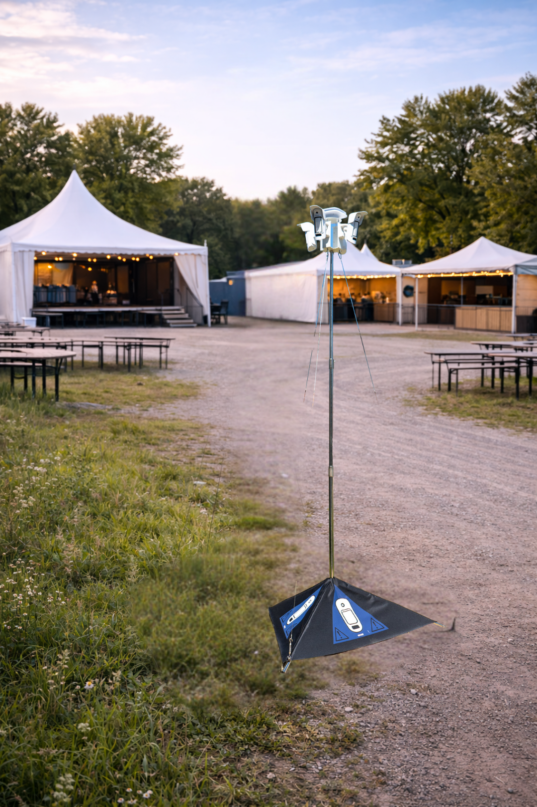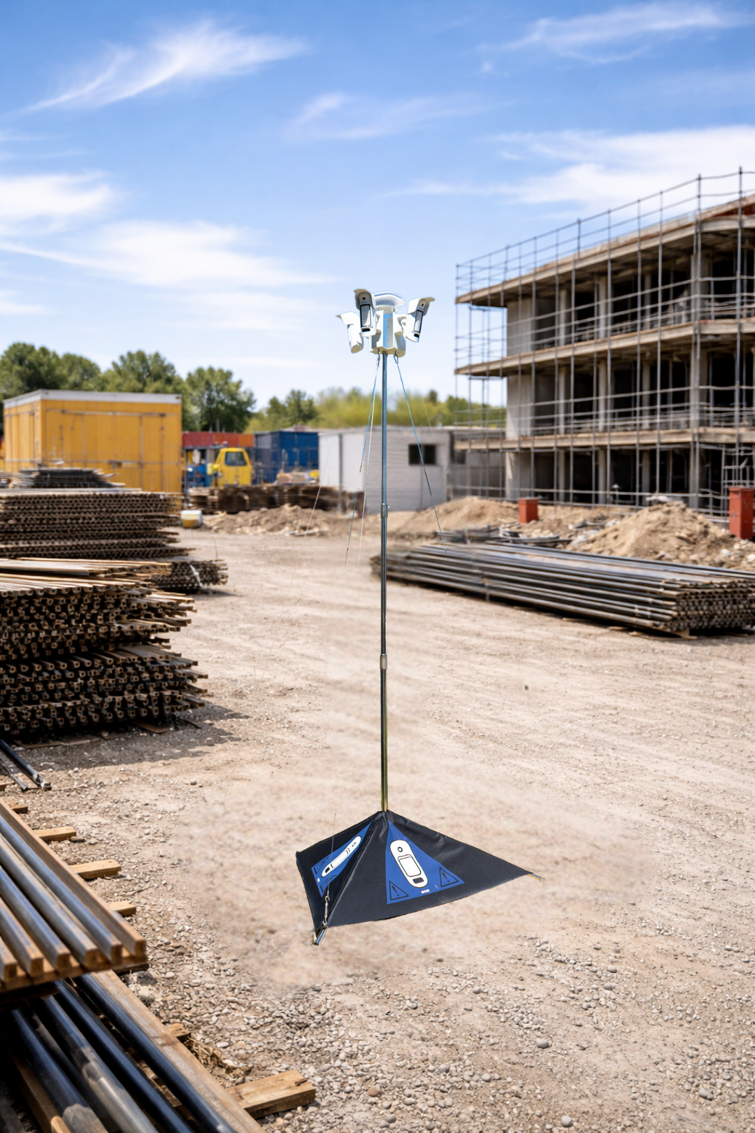 Für größere Flächen lässt sich das System über einen Masterturm mit zwei bis drei weiteren Überwachungsmasten vernetzen. So entsteht ein vollständig funkvernetztes, skalierbares Sicherheitskonzept – optimal für große Baustellen, Veranstaltungsflächen oder weitläufige Areale.
